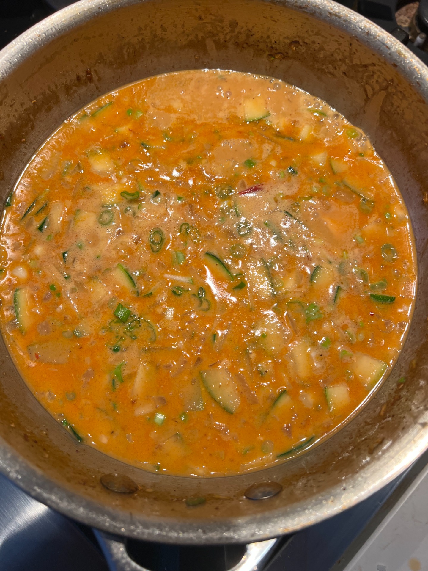 - Après avoir fait suer ajouter le bouillon de poulet et un peu d'eau 250ml et laisser mijoter 12 minutes