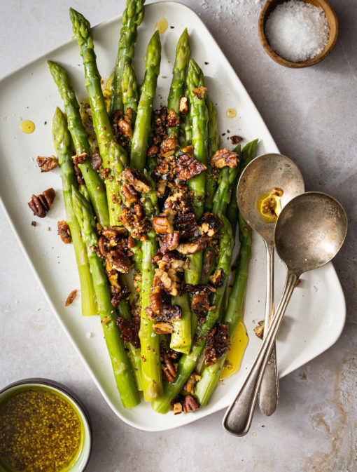 - Déposer les asperges dans une assiette de service, garnir de croquant de pacanes et prosciutto et arroser de vinaigrette